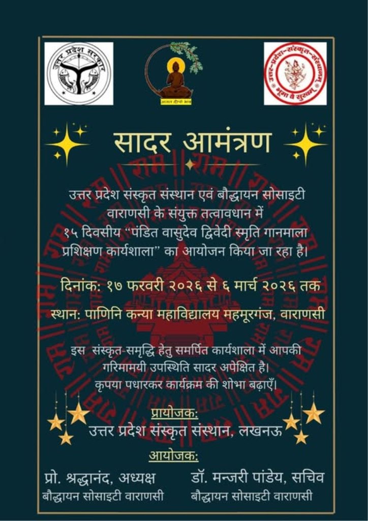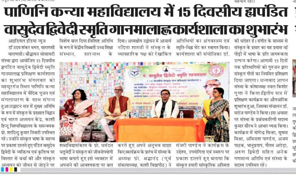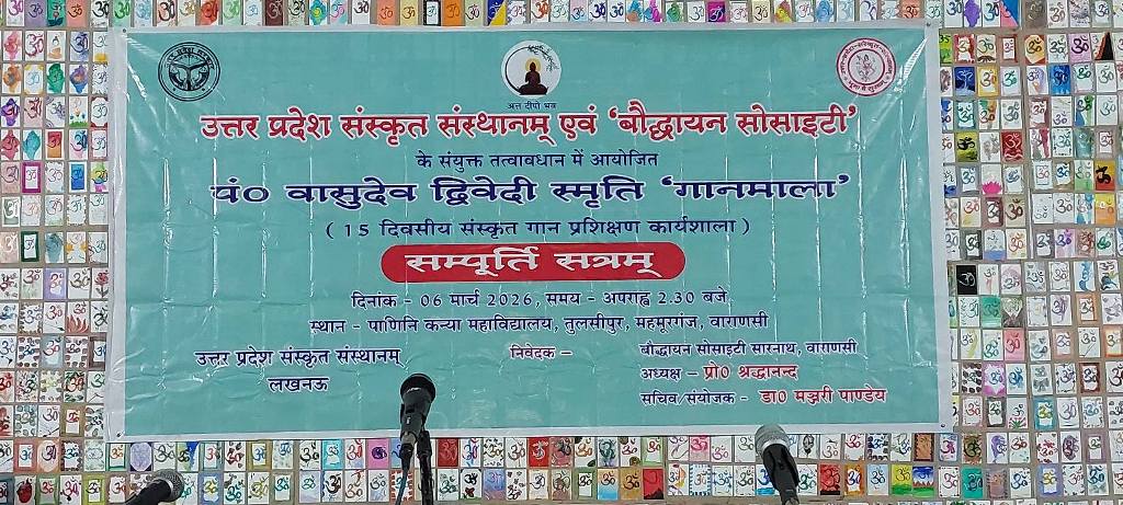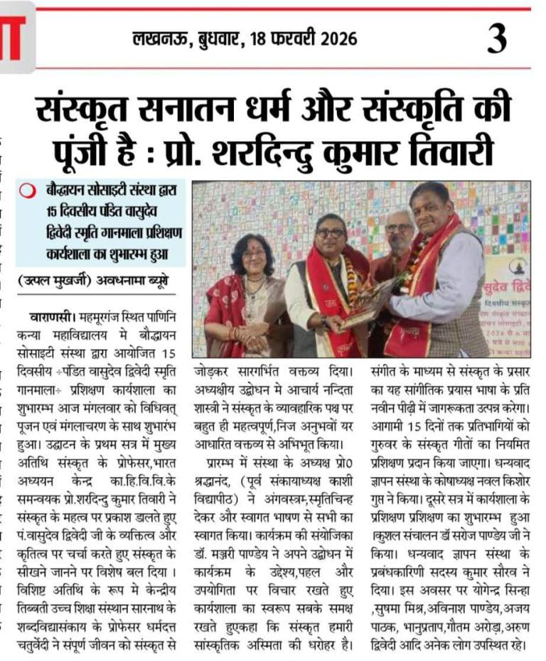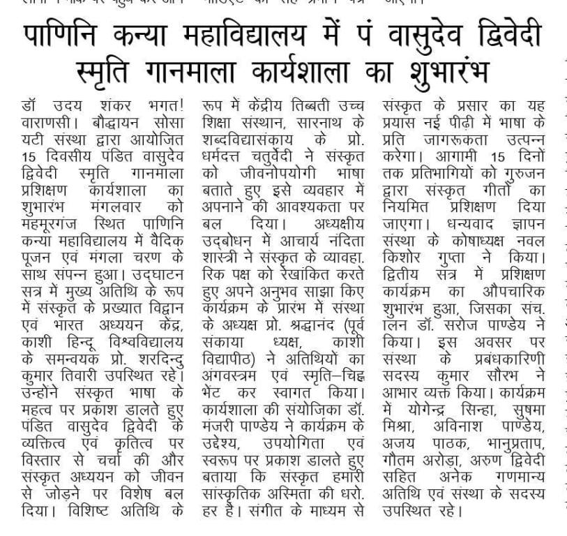 उत्तर प्रदेश संस्कृत संस्थानम् ,लखनऊ और बौद्धायन सोसाइटी , वाराणसी के संयुक्त तत्वावधान में दिनांक 17 फरवरी 2026 से 5 मार्च 2026 तक पंद्रह दिवसीय " पं. वासुदेव द्विवेदी स्मृति गानमाला " प्रशिक्षण कार्यशाला का आज 6 मार्च को पाणिनि कन्या महाविद्यालय , महमूरगंज में समापन हुआ। जिसमें सार्वभौम संस्कृत संस्थान, वाराणसी के संस्थापक, संस्कृत के लिये जीवन समर्पित करने वाले आचार्यवरेण्य पं.वासुदेव द्विवेदी जी के संस्कृत गीतों का सैद्धांतिक और प्रायोगिक प्रशिक्षण दिया गया ।